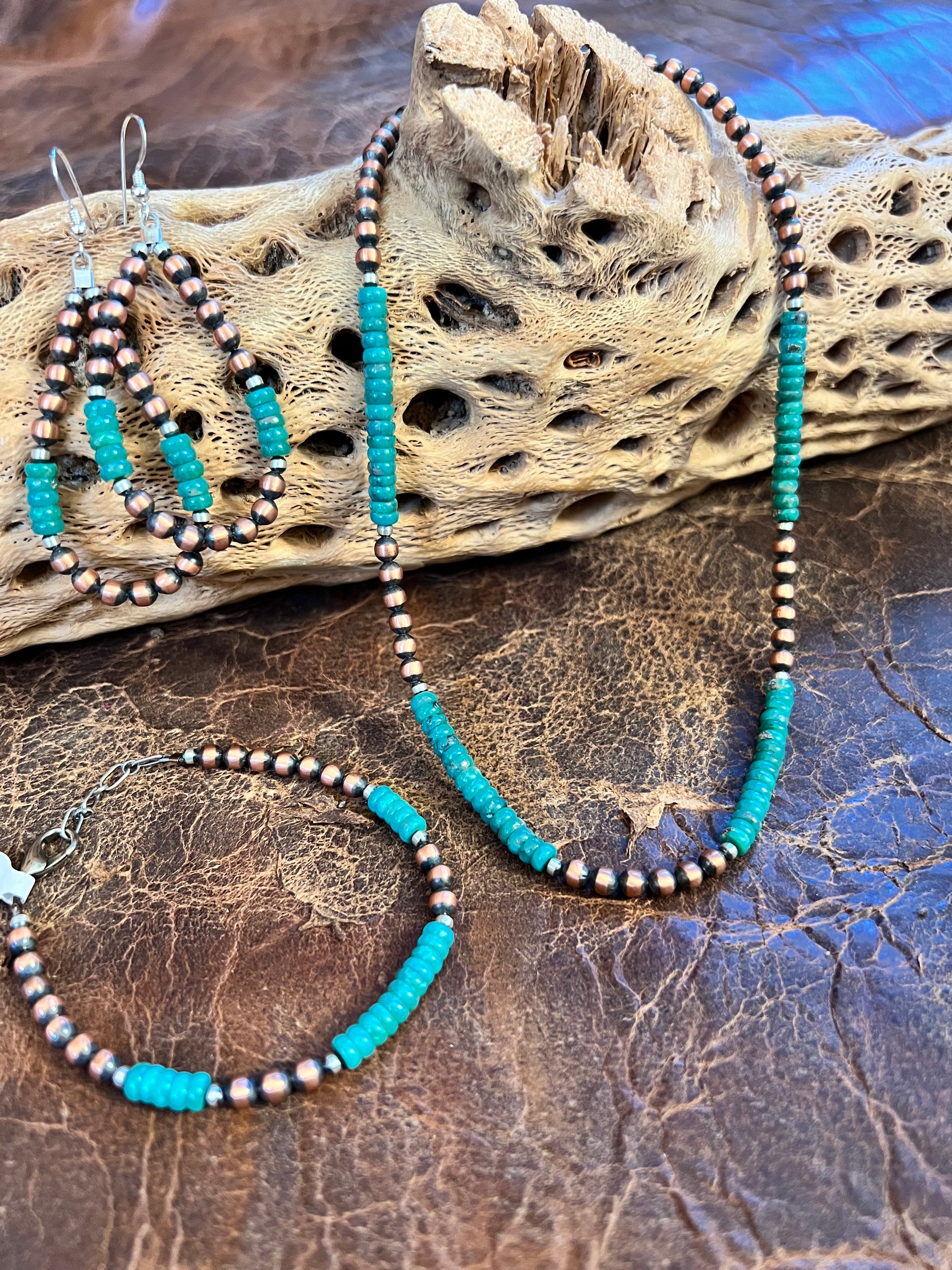 Copper Copper, Sterling & Tyrone Turquoise Bead 5mm Necklace 16β-18β, Bracelet 6-7β & Earrings 3β SET