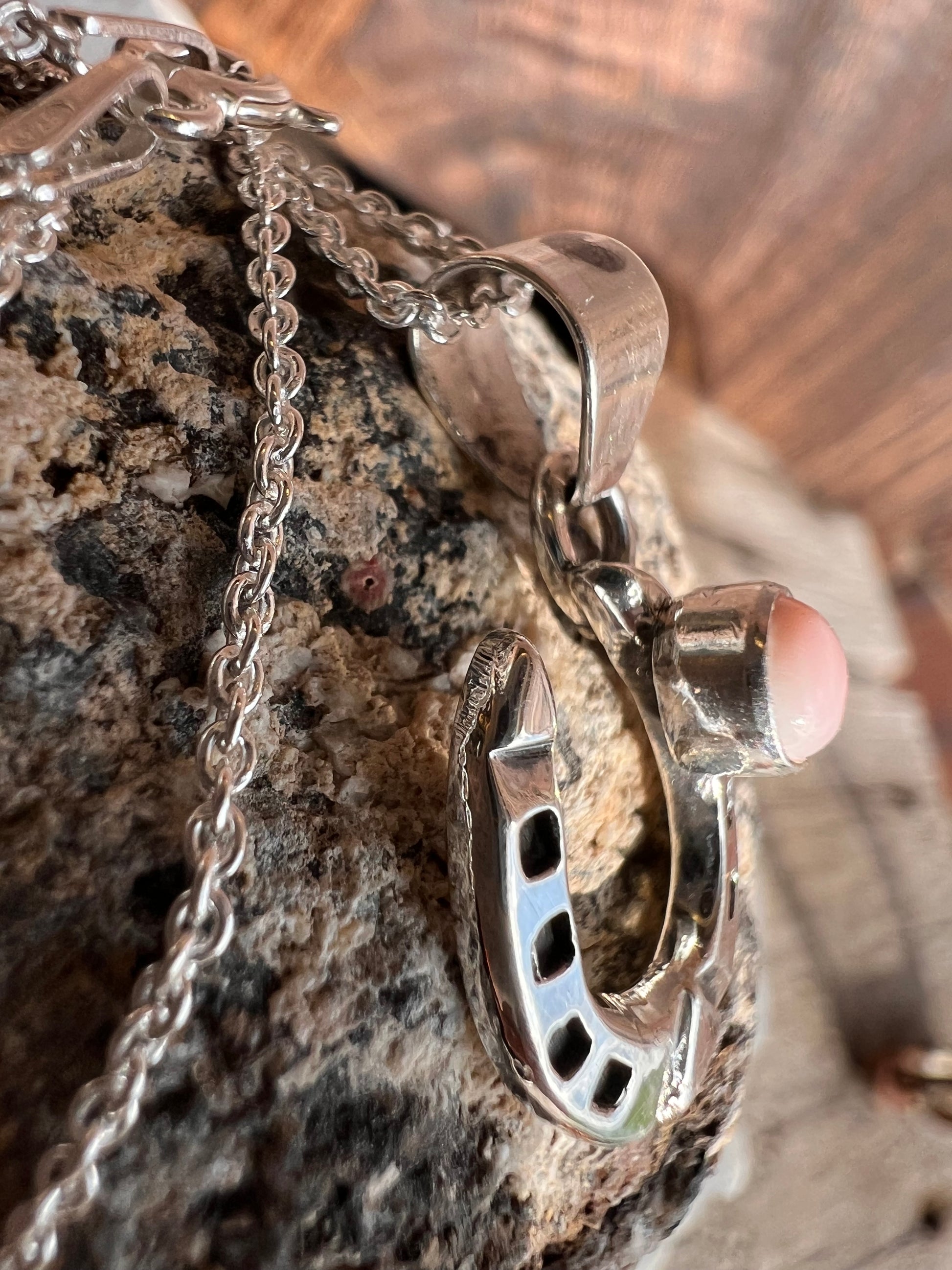 Handmade Pink Conch Shell Horse Shoe Pendant on a Sterling Rolo Chain Necklace 18”