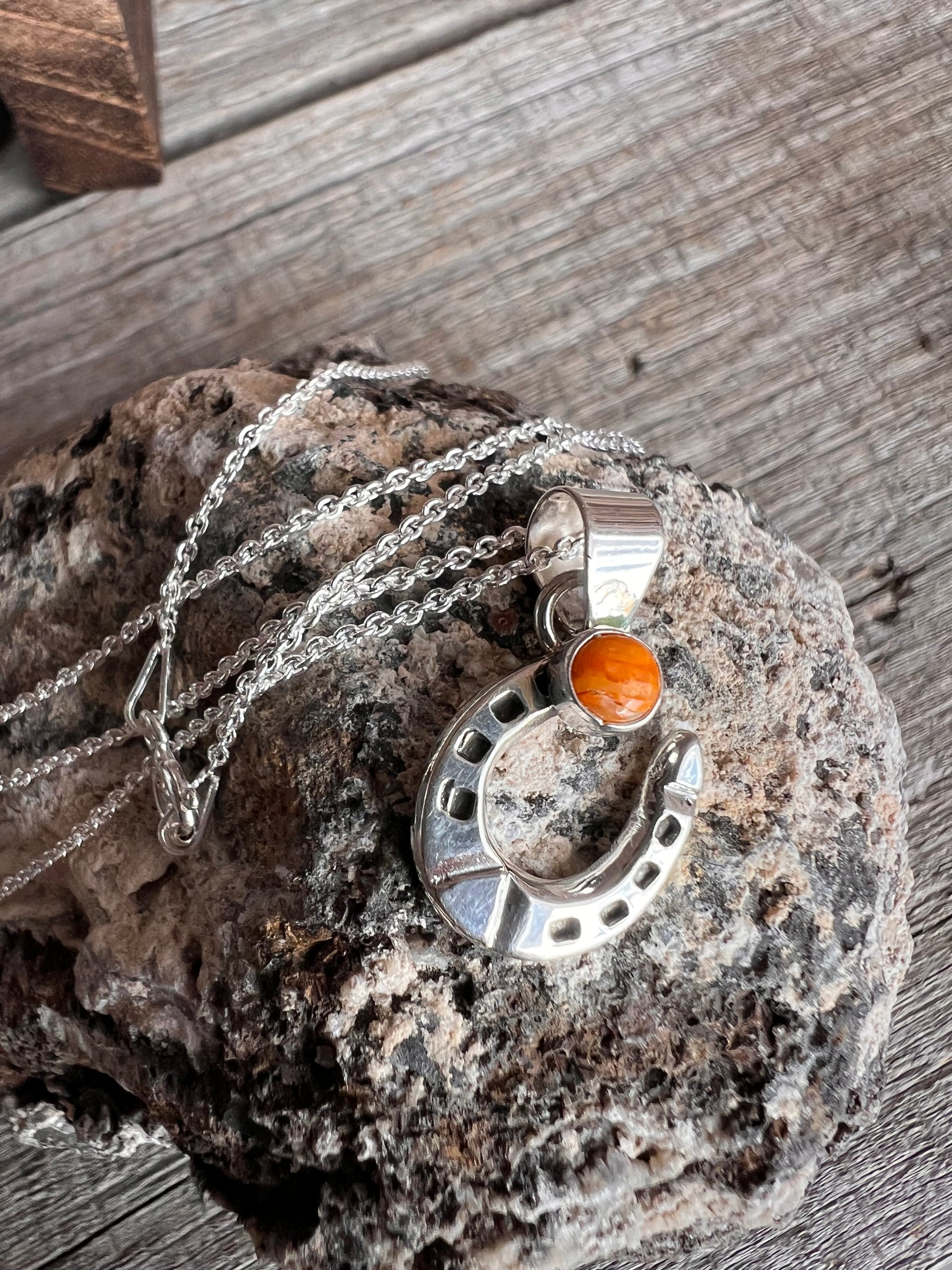 Handmade Orange Spiny Oyster Horse Shoe Pendant on a Sterling Rolo Chain Necklace 18”