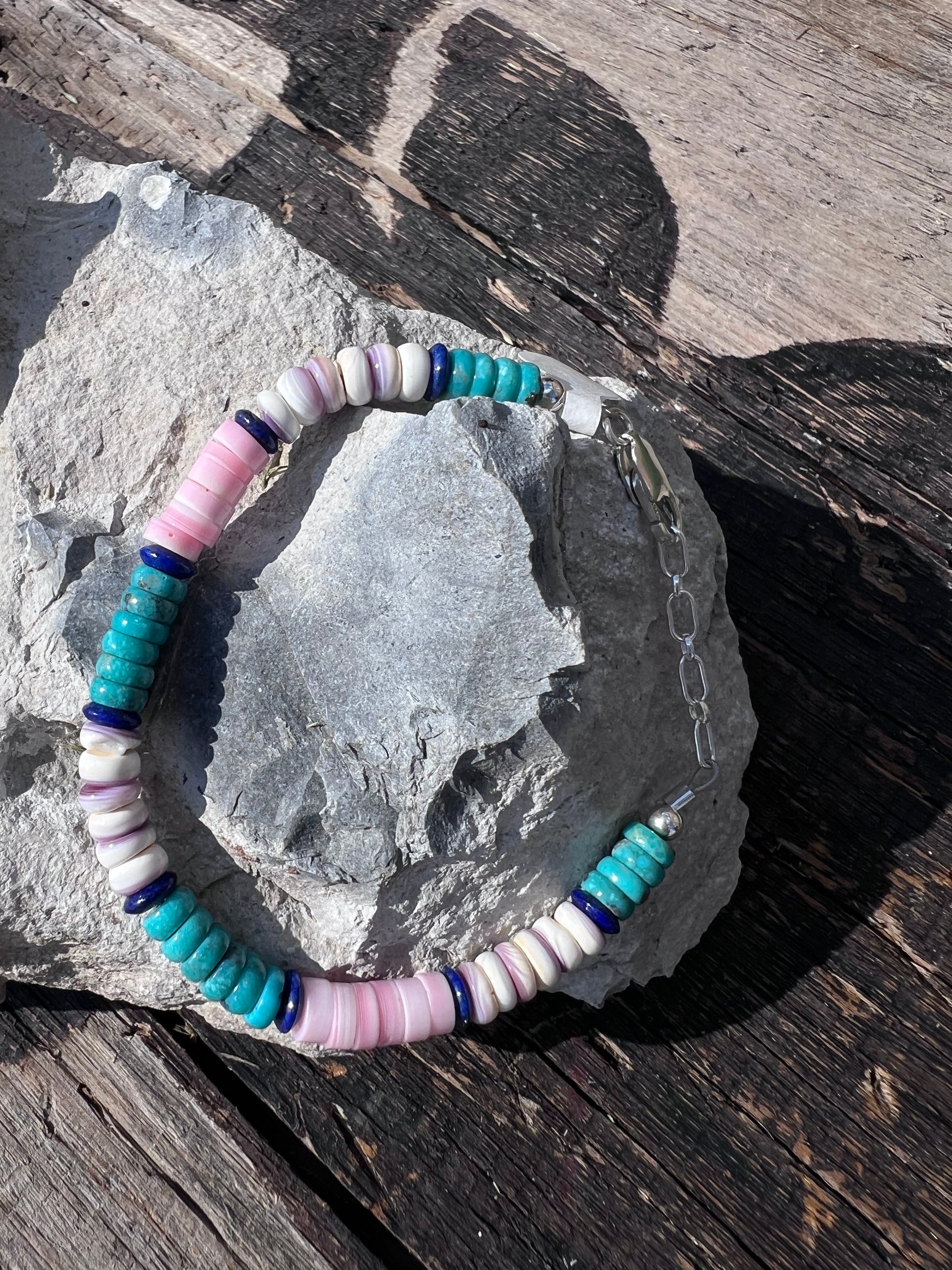 Lapis, Pink Conch, Turquoise, Wampum w/ Sterling Bracelet & Earrings Set