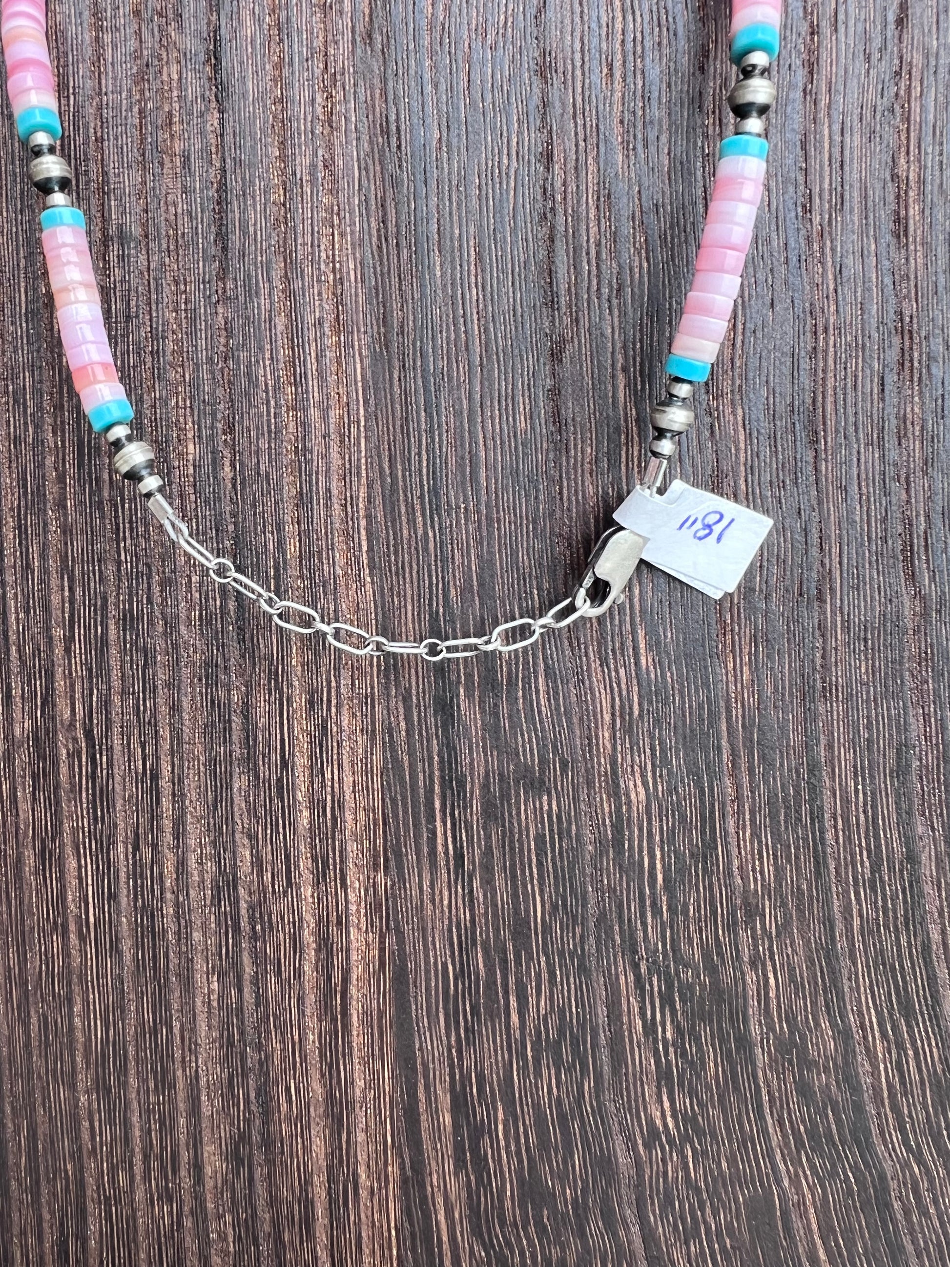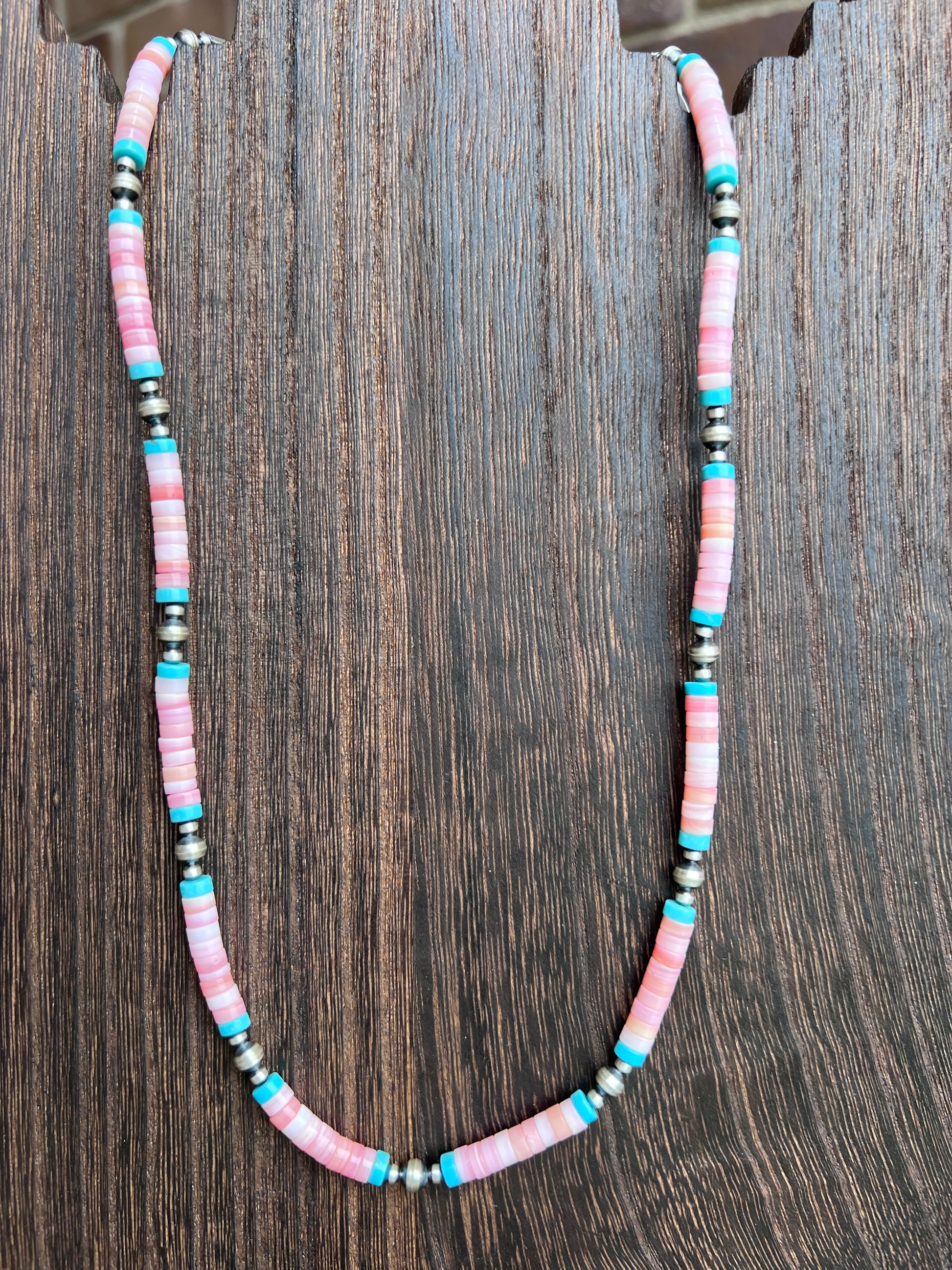 Southwest Sterling, Pink Conch & Turquoise Heishi Necklace & Earring Set