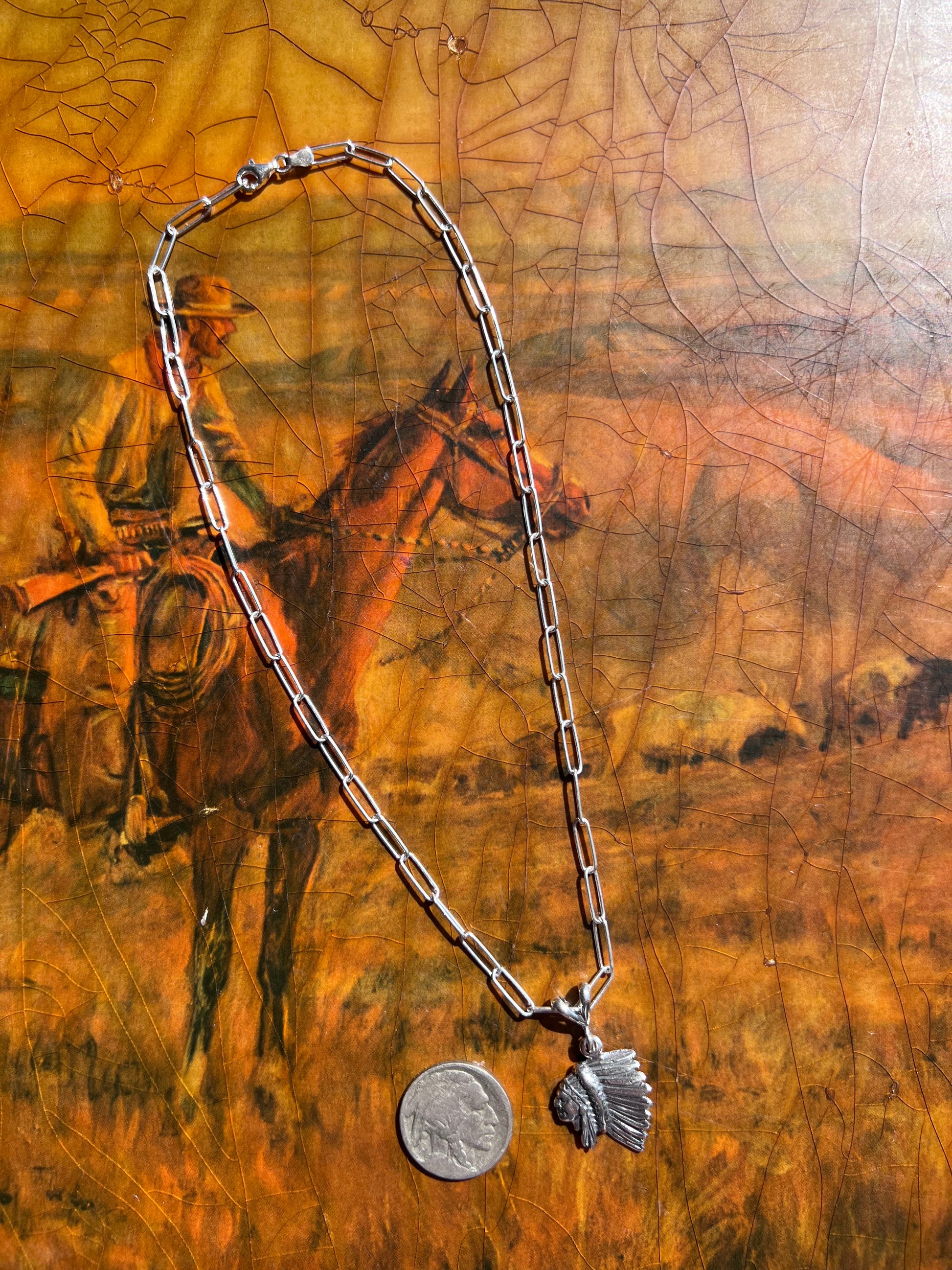 Sterling Silver Native American Chief Head Pendant & Paperclip High-shine Sterling Necklace 16”
