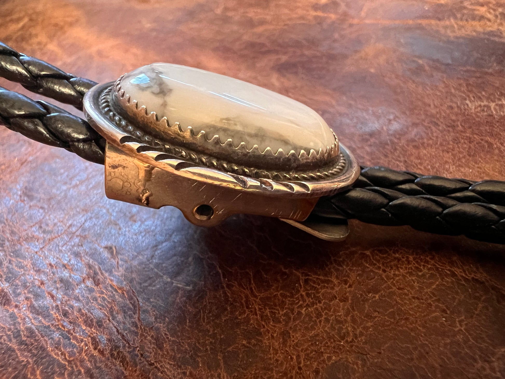 Navajo Handmade White Buffalo and Sterling with Black Braided Leather Bolo Necklace with Sterling Tips.