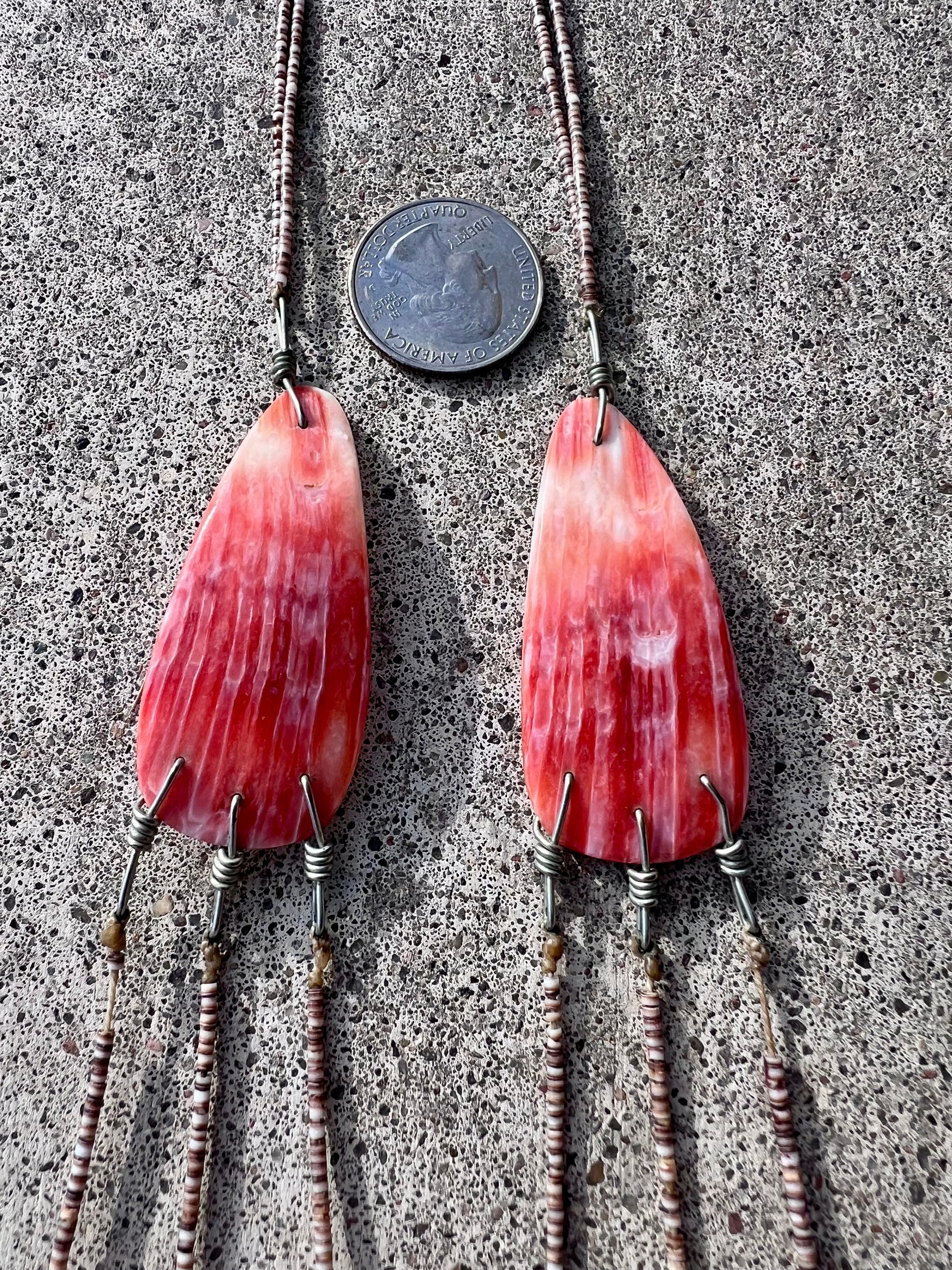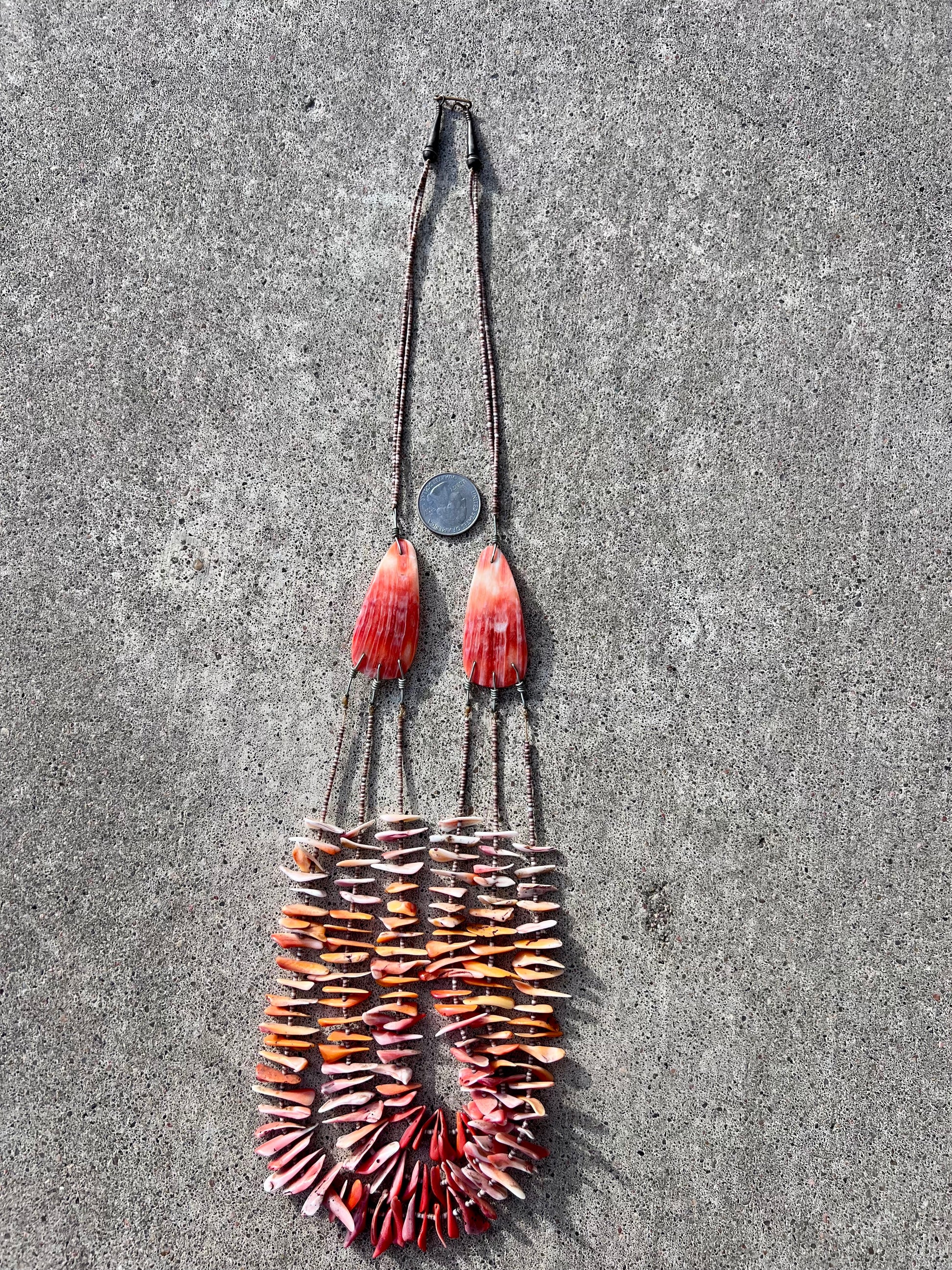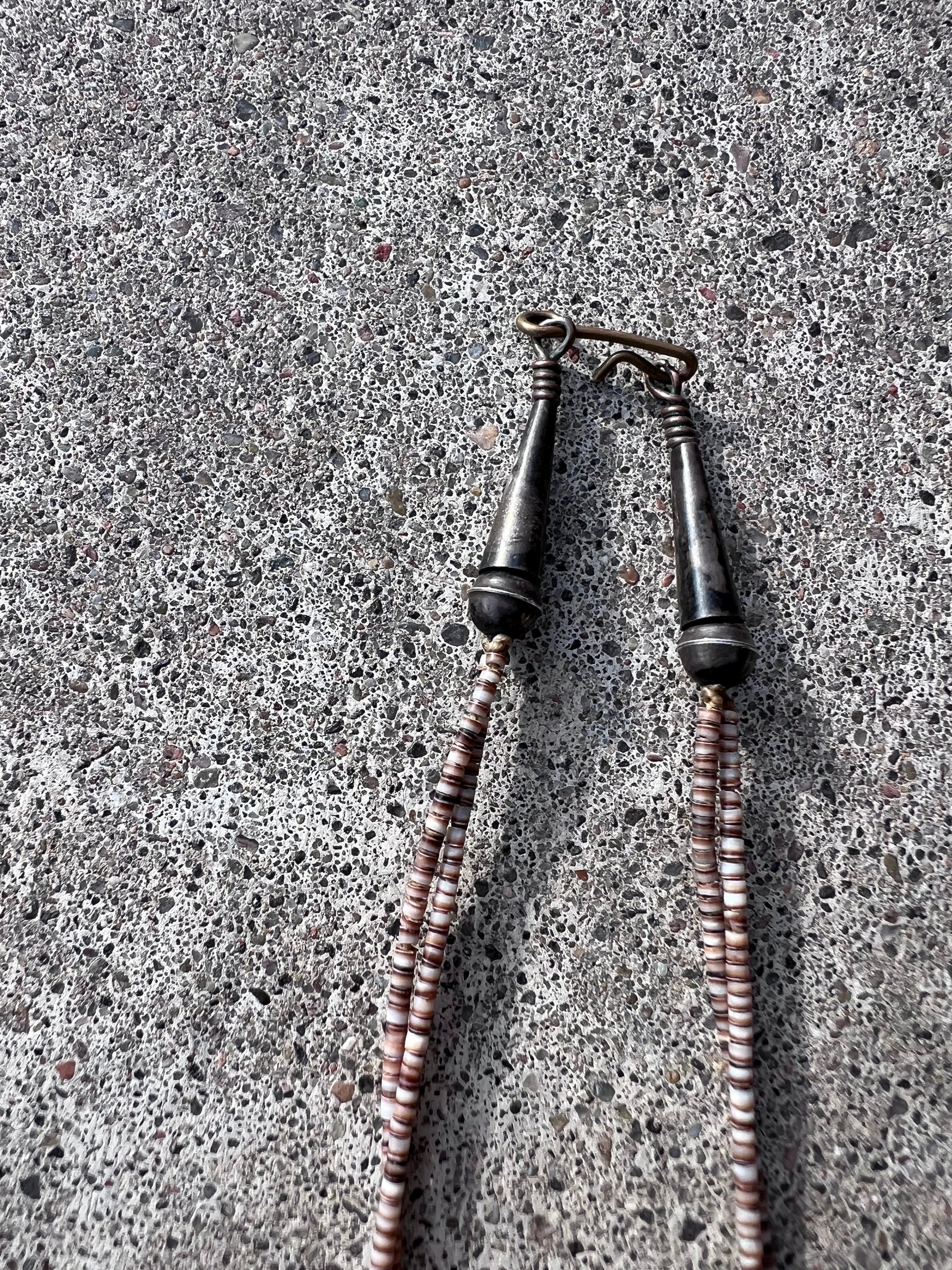 Vintage Kewa Santa Domingo traditional piece. It has Sterling Silver cones with very fine Olive Shell Heishi and 3-strands of spondylus Spiny Oyster with a beautiful ombré affect. In amazing condition for its age. A beautiful collector’s piece!!