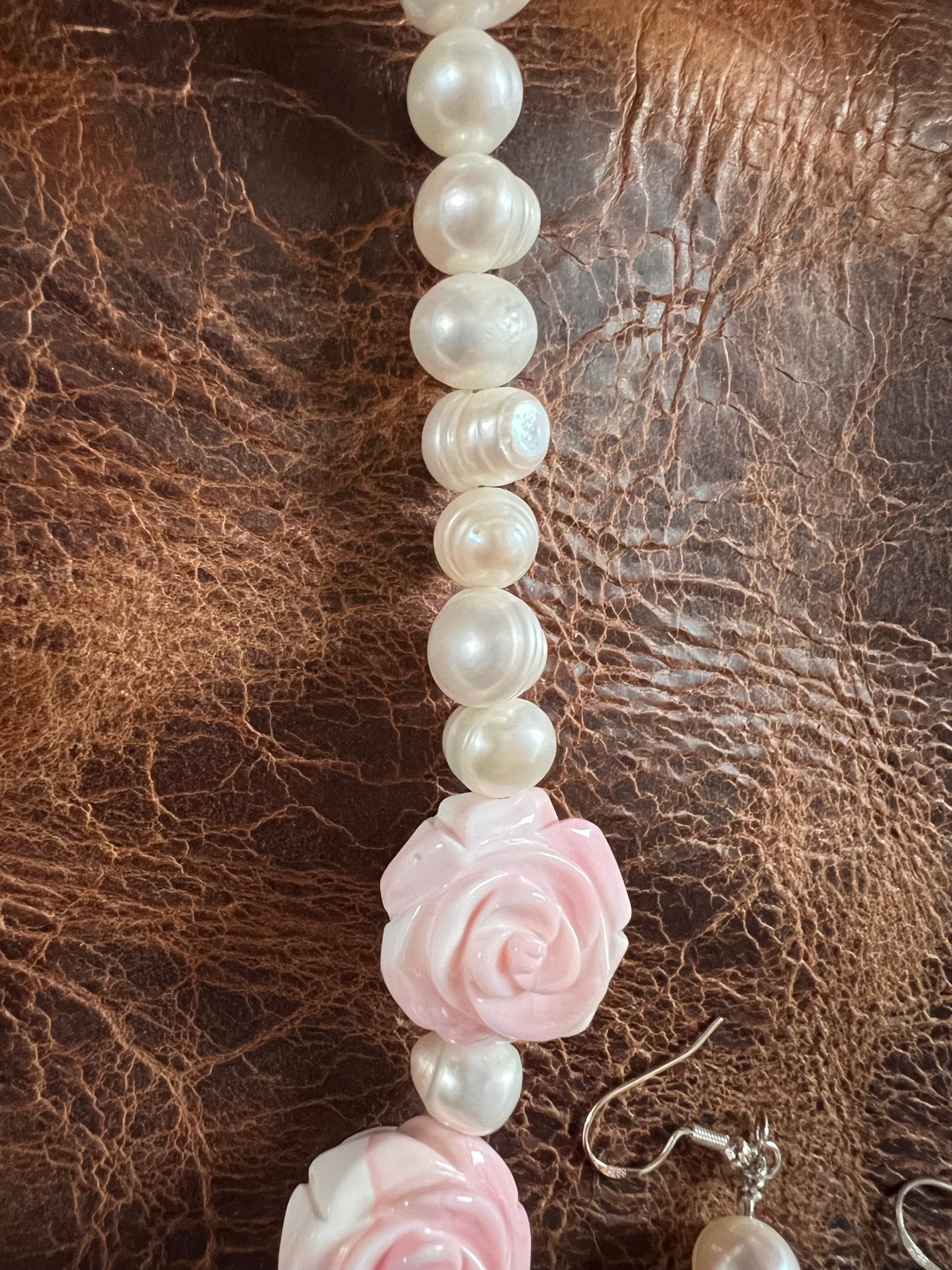 Pink Conch Shell Carved Rose & Natural Freshwater Pearl Necklace, Bracelet & Earrings Set