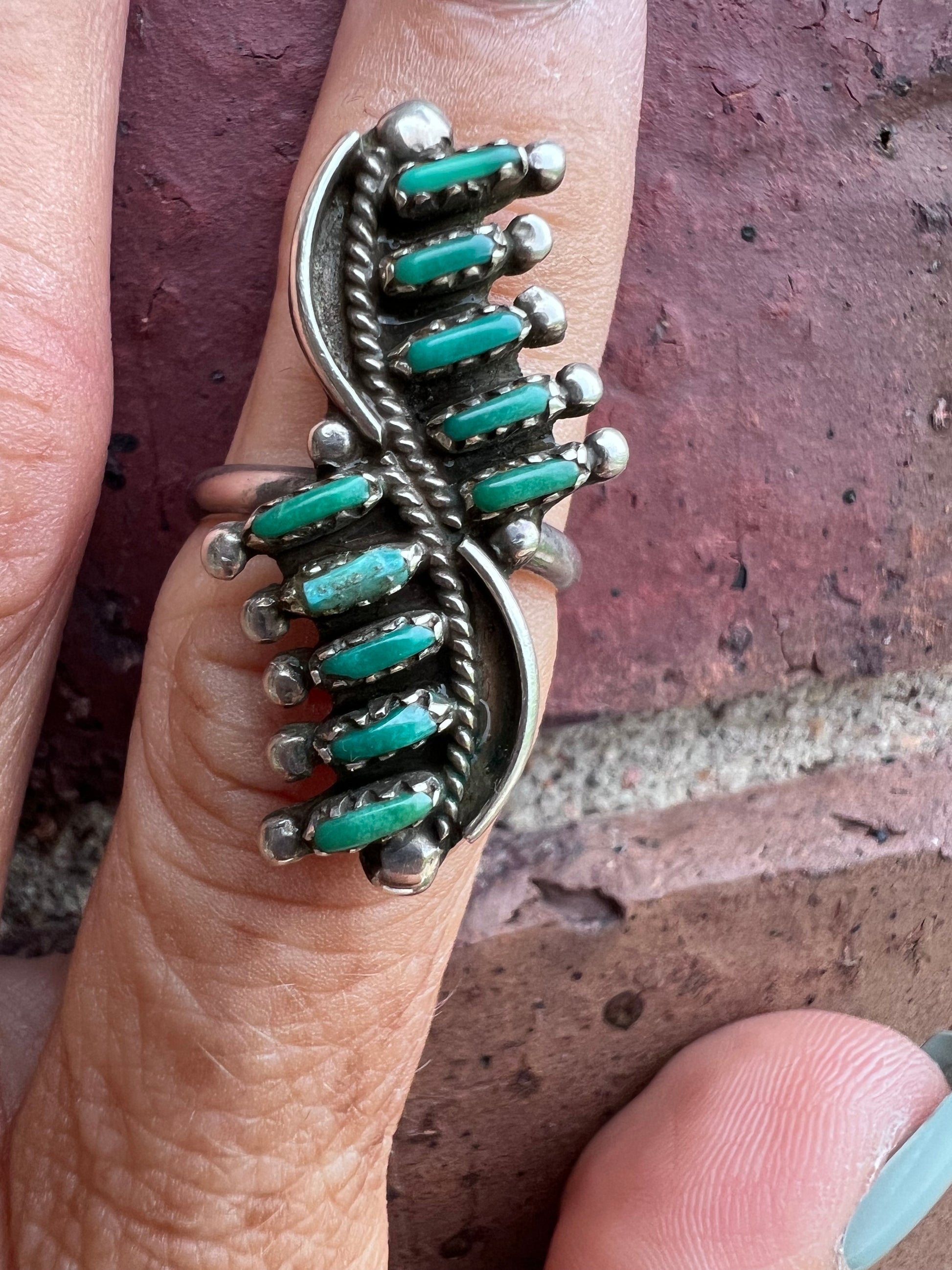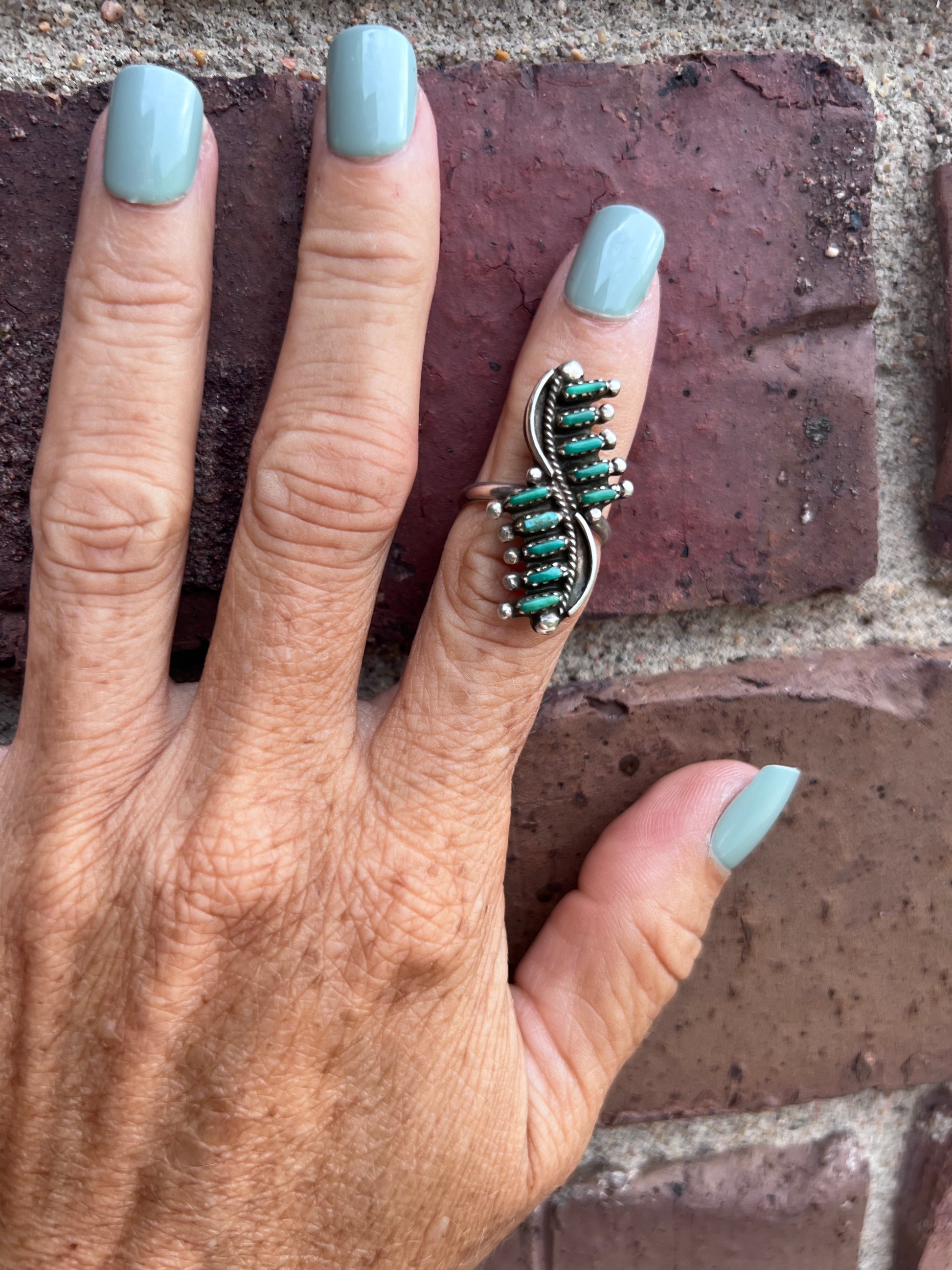 Vintage Native Zuni Handmade Needle Point Green Turquoise Ring.